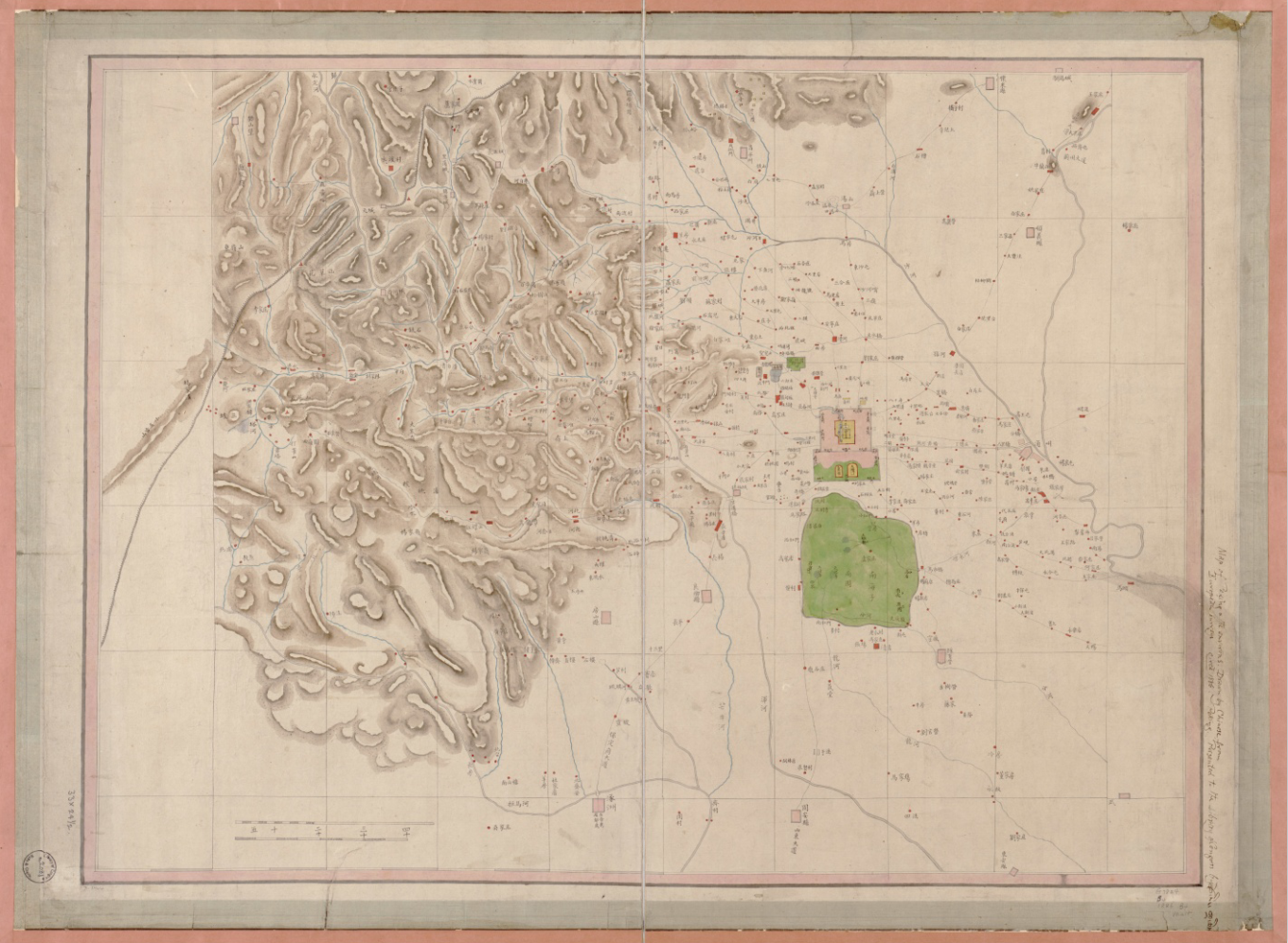 此《北京城近郊图》标注英文名称为 Map of Peking & the environs,为清光绪十二年(1886)彩绘本,据图右侧的英文注记,这幅图系1886年由一位中国人通过欧洲人在北京地区的调查而绘制。描绘北京城郊的山岭、河流、城镇、村庄及道路等地理情况,具有明显的西方地图风格。