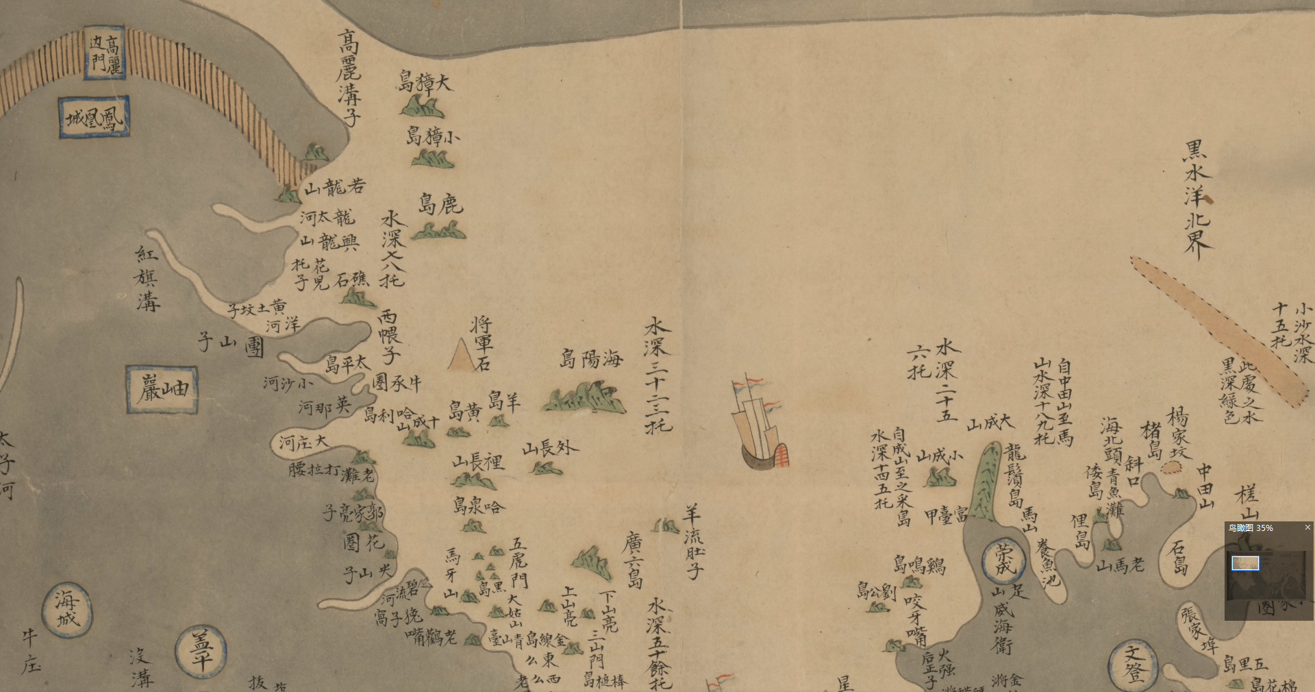 此《江海全图》绘制于清道光年间,描绘了浙江、江苏、山东、直隶、盛京等省的沿海省府州县等行政区划以及海岸线和主要河流情况,左北右南,深色绿地,浅色海洋。全图对中国沿海河口、岛屿、暗沙、水深及航海里程等信息都做了详细记录。从图记内容来看,此图或为导引海上行船的航线或指导航行中宜避开的海中暗沙,是研究这一时期中国海运发展的重要资料。