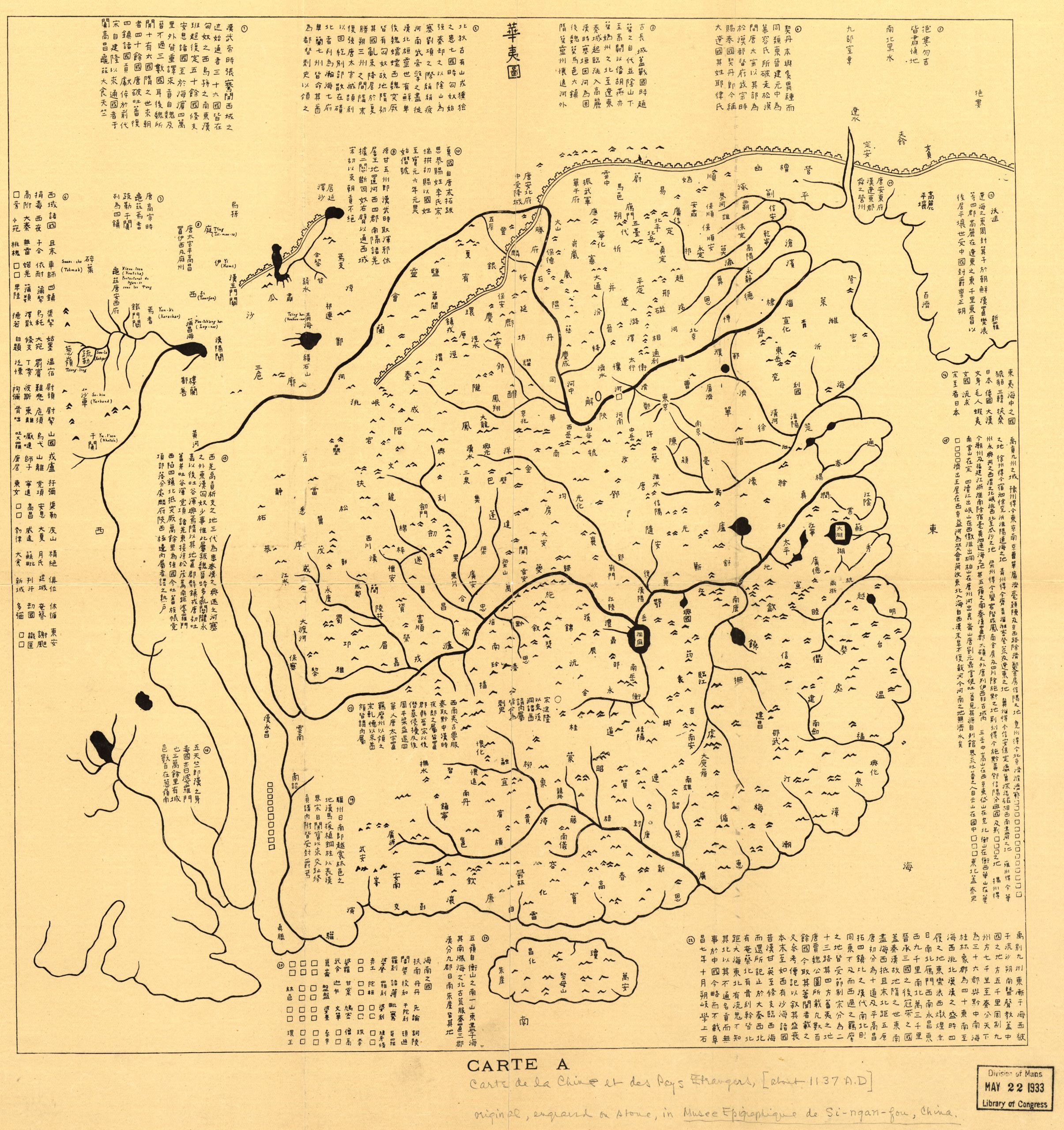 《华夷图》为中国宋代石刻地图,伪齐阜昌七年(1136)刻,现存西安碑林,是中国现存最早的一幅全国地图,图中将全国的山脉、河流及各州的地理位置都表现了出来,许多城镇的位置都比较正确,还画出了长城。图中大河的流向大抵近实,但江河河源不够准确,海岸线的轮廓尤为失真。此《华夷图》为后世拓本。