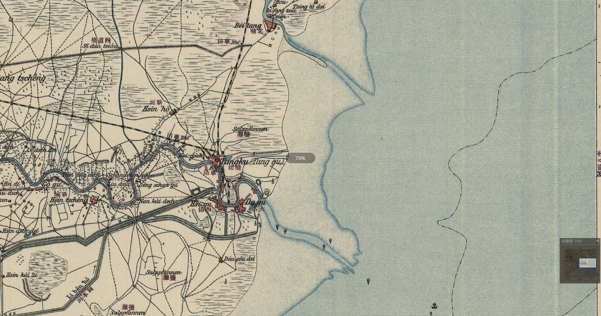 此《天津地图》为1907年德国陆军参谋处测绘的天津地区地图,全图比例尺二十万分之一,中外双文标注,上部为天津县部分区域,下部为静海县部分区域,右上可见芦台县城,西侧为塘沽出海口。图中标注有天津至塘沽的铁道现,经军粮城。图中天津县城标注情况可大致看出清末时期天津城布局情况。