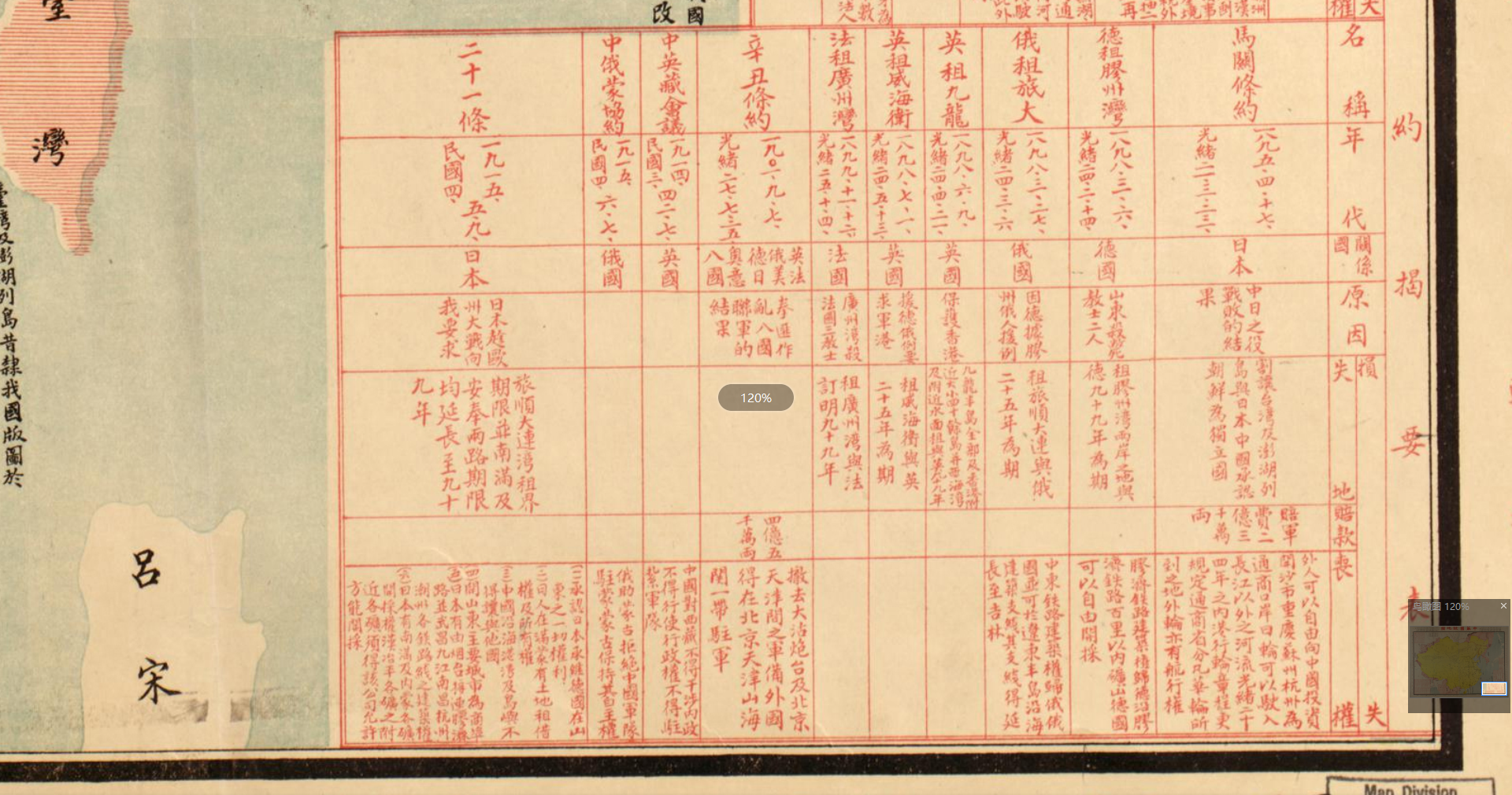 地图左上附有“中华国耻近三百年失地表”,展示了自尼布楚条约以来中国同列强签订的割地条约及丧失的领土面积;左下附有“中华国耻立约开放商埠表”,展示了近代以来被迫开放的通商口岸;右下为“中华国耻不平等条约揭要表”,展示了中国近代被迫签订的不平等条约及主要内容。