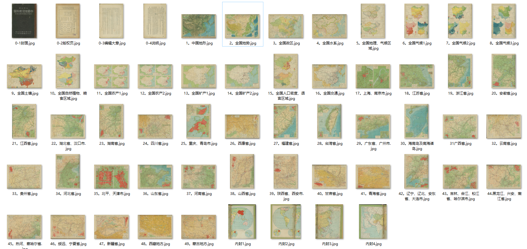 此《中国地理教科图》是1947年中国史地图表编纂社编纂,亚光舆地学社出版的,用于民国中学教学使用的地图册,包括中国地形图、全图地势图、全国政区图、全国水系图、全国气候图、全国土壤图等31幅介绍中国地理概况的全图,以及各省市地图和世界地图等共35幅。
